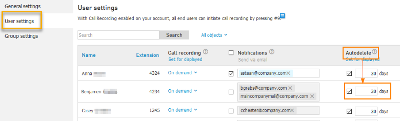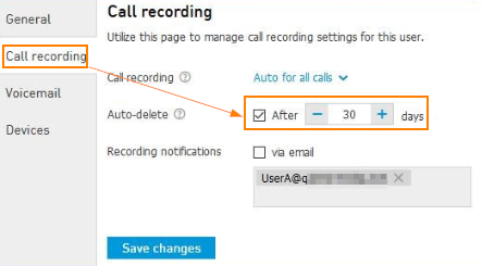 - Set the auto delete time for the number of days for call recordings to be saved on the servers.