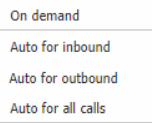 - Auto for inbound – records all inbound calls. Outbound calls that are not set to auto-recording can still be recorded on-demand.